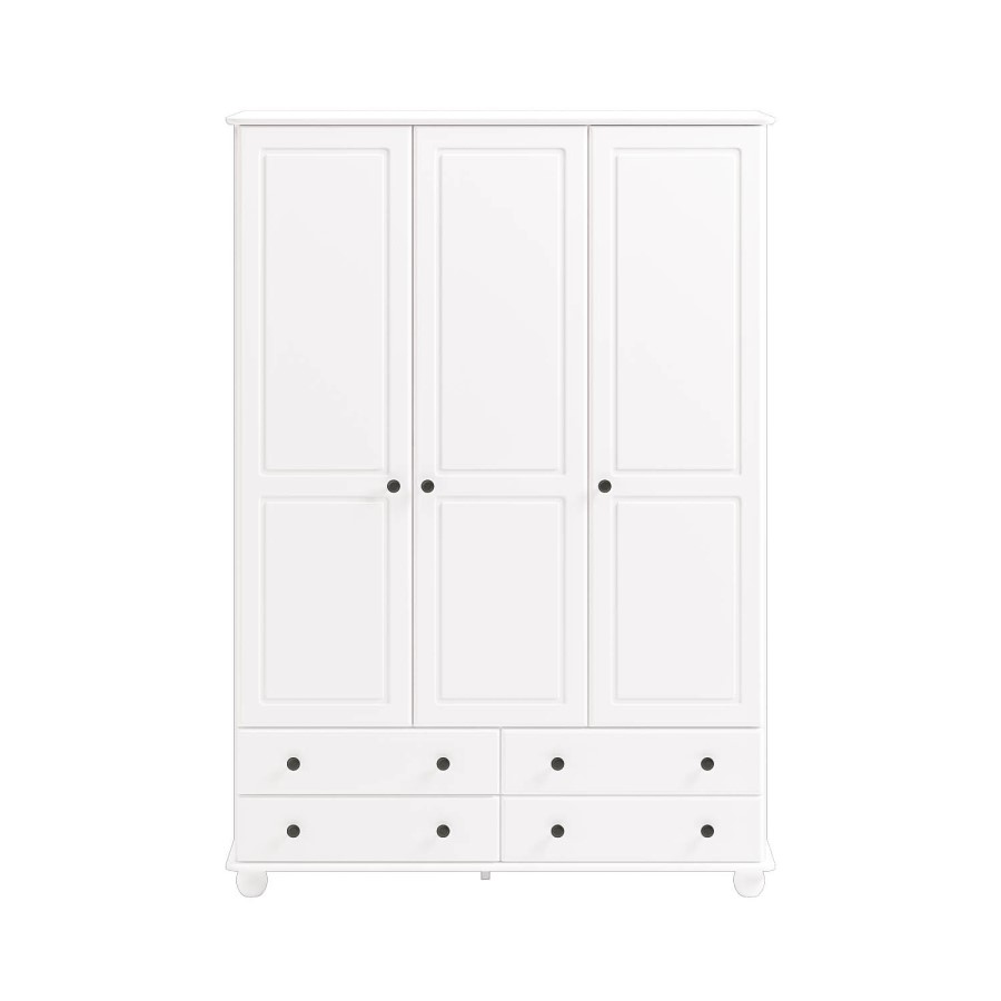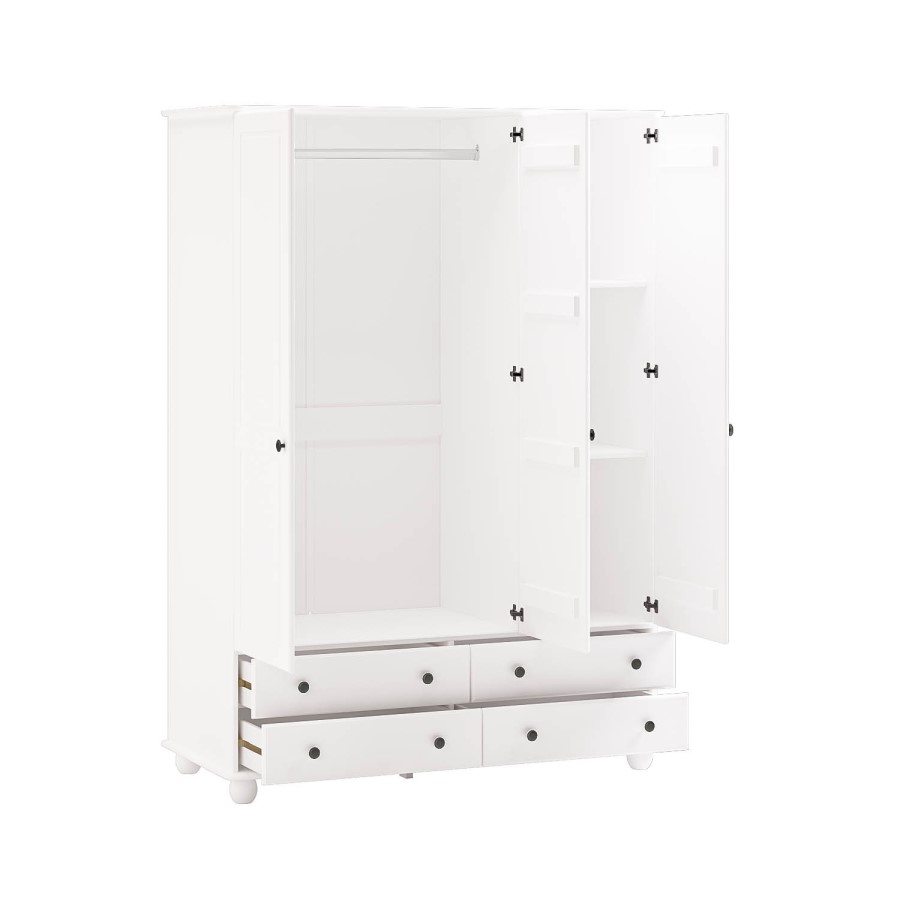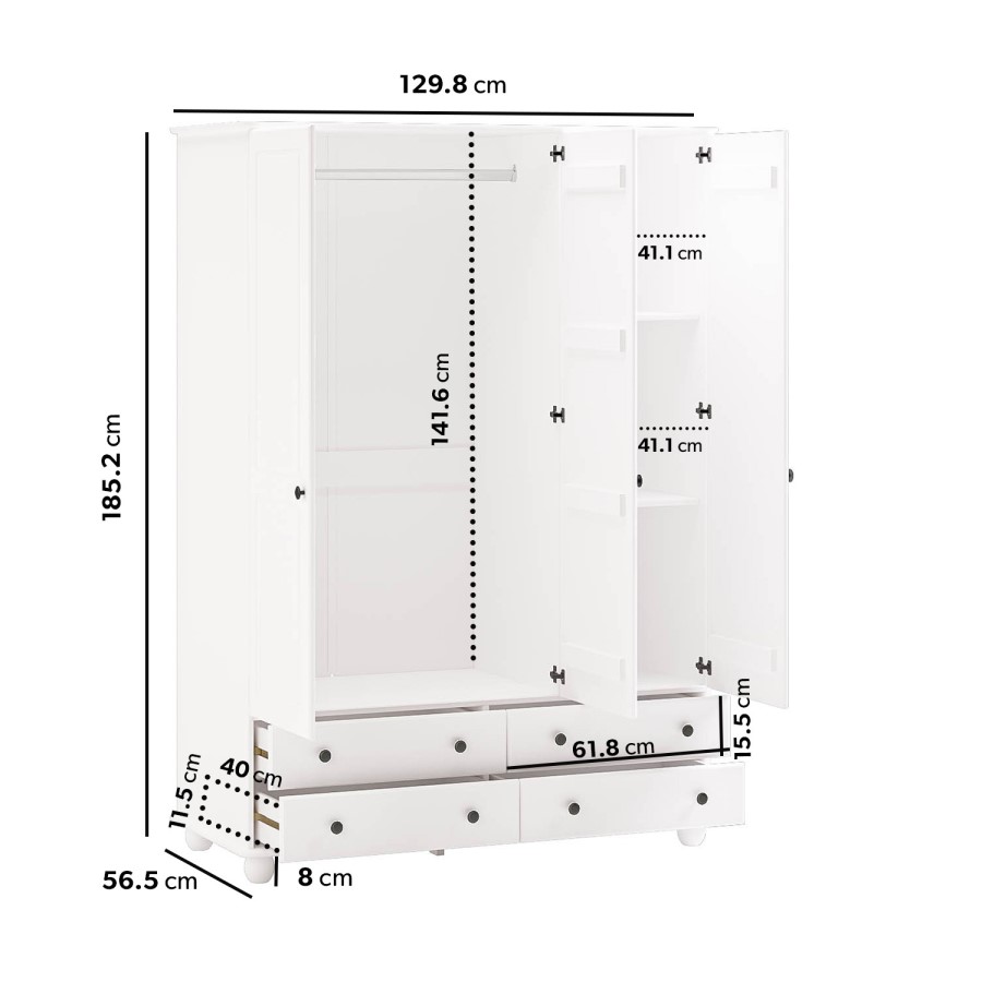 Keep your clothes and everyday essentials organized with the stylish Hampton 3-door wardrobe. Behind the double doors, you’ll find a generous hanging space, while the third door opens to reveal three shelves and four drawers—perfect for storing shoes, accessories, or folded garments.